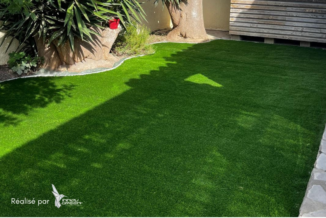 Notre gazon synthétique Océan 40 a embelli ce jardin. Des clients qui pourront en profiter dès l'arrivée des beaux jours.